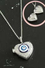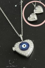Kalp Nazar Kapaklı Zirkon Taşlı Çelik Kolye-Gümüş Rengi
