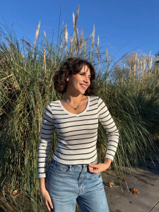 V Yaka Çizgili Bluz Bej A3699 (Beden: M)
