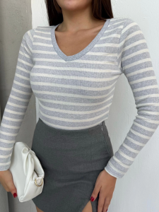 V Yaka Çizgili Bluz Gri A3699 (Beden: S)