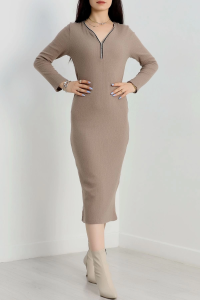 Fermuar Detaylı Fitilli Şardonlu Elbise Bej A3178 (Beden: Standart) adet