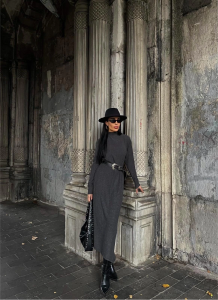 Boğazlı Kalın Bürümcük Uzun Elbise Gri (Beden: M)