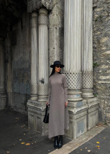 Boğazlı Kalın Bürümcük Uzun Elbise Vizon (Beden: M)