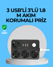 2 Metre Kablolu 3 USB Portlu Anahtarlı Üçlü Priz