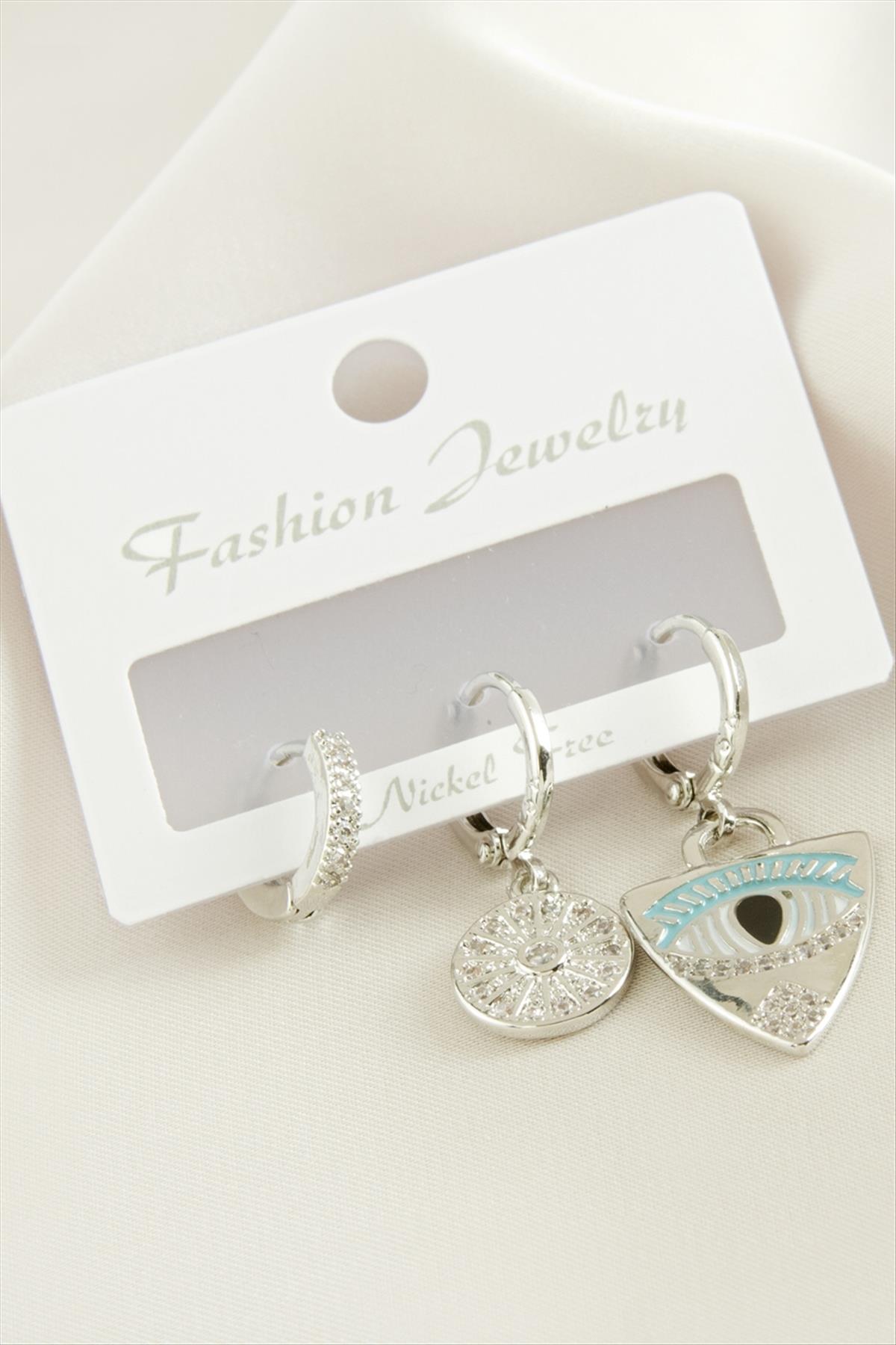 3 Adet Göz Zirkon Taşlı Küpe-Gümüş Rengi