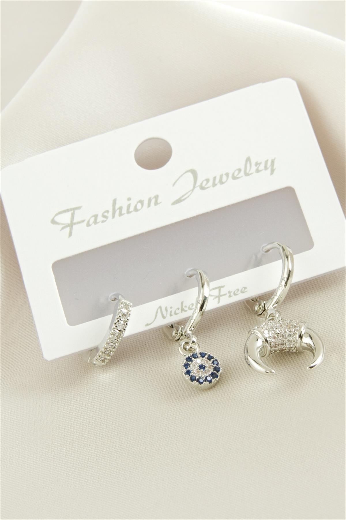 3 Adet Hilal Zirkon Taşlı Küpe-Gümüş Rengi