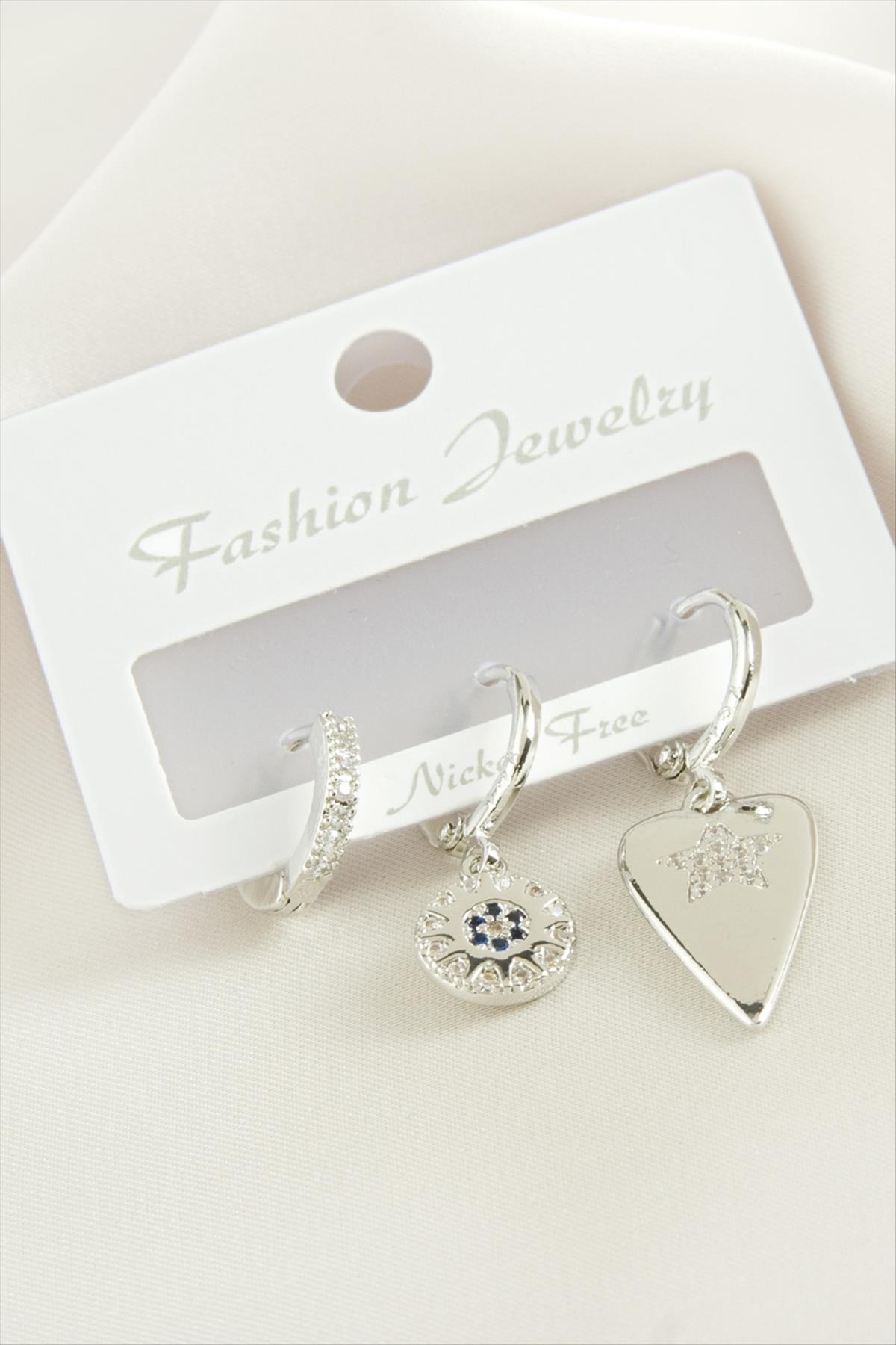 3 Adet Kalp Zirkon Taşlı Küpe-Gümüş Rengi