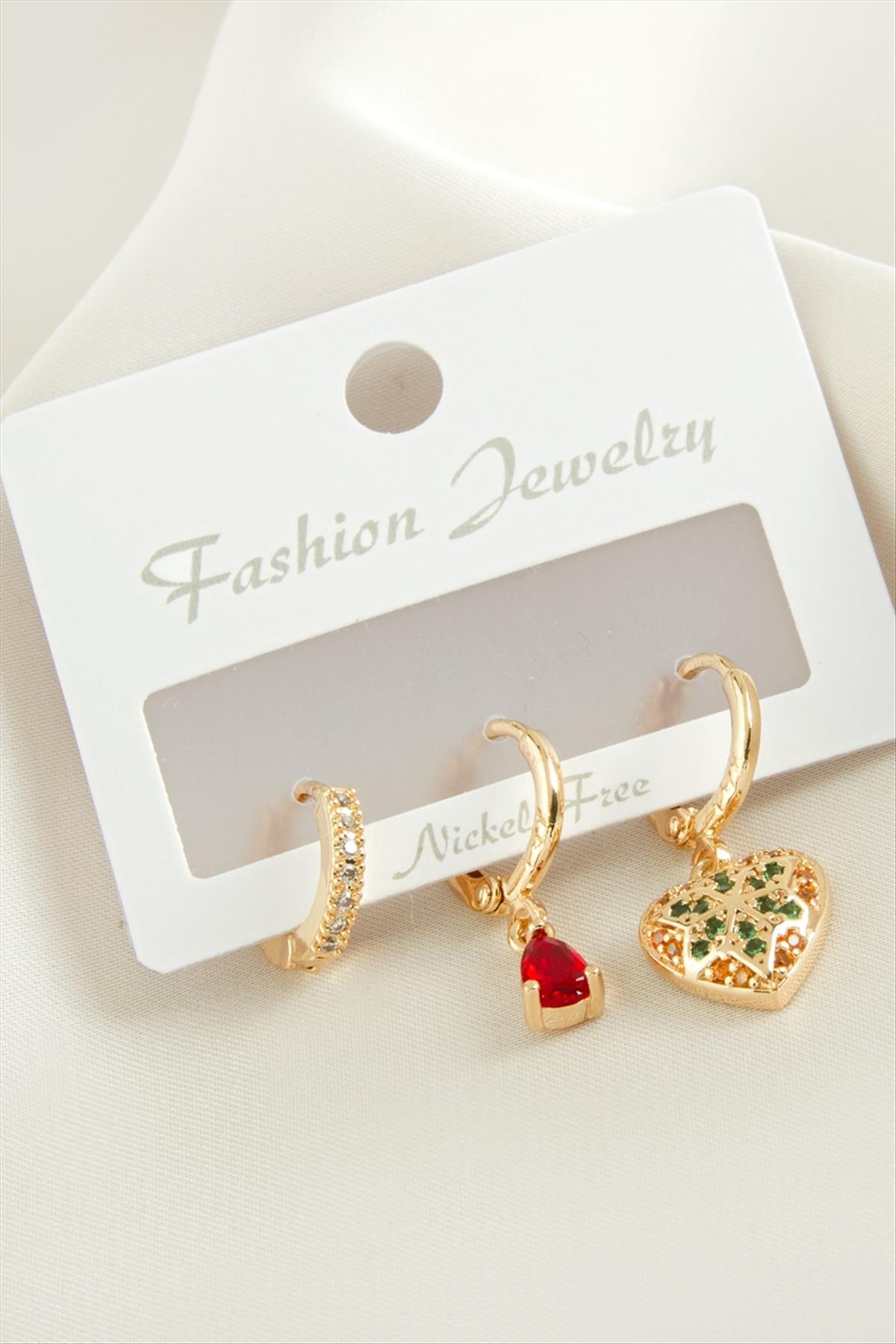 3 Adet Kalp Zirkon Taşlı Küpe