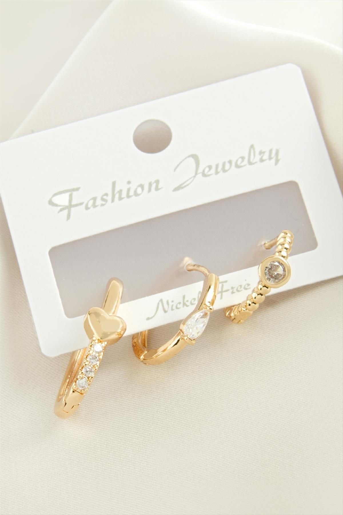3 Adet Kalp Zirkon Taşlı Küpe