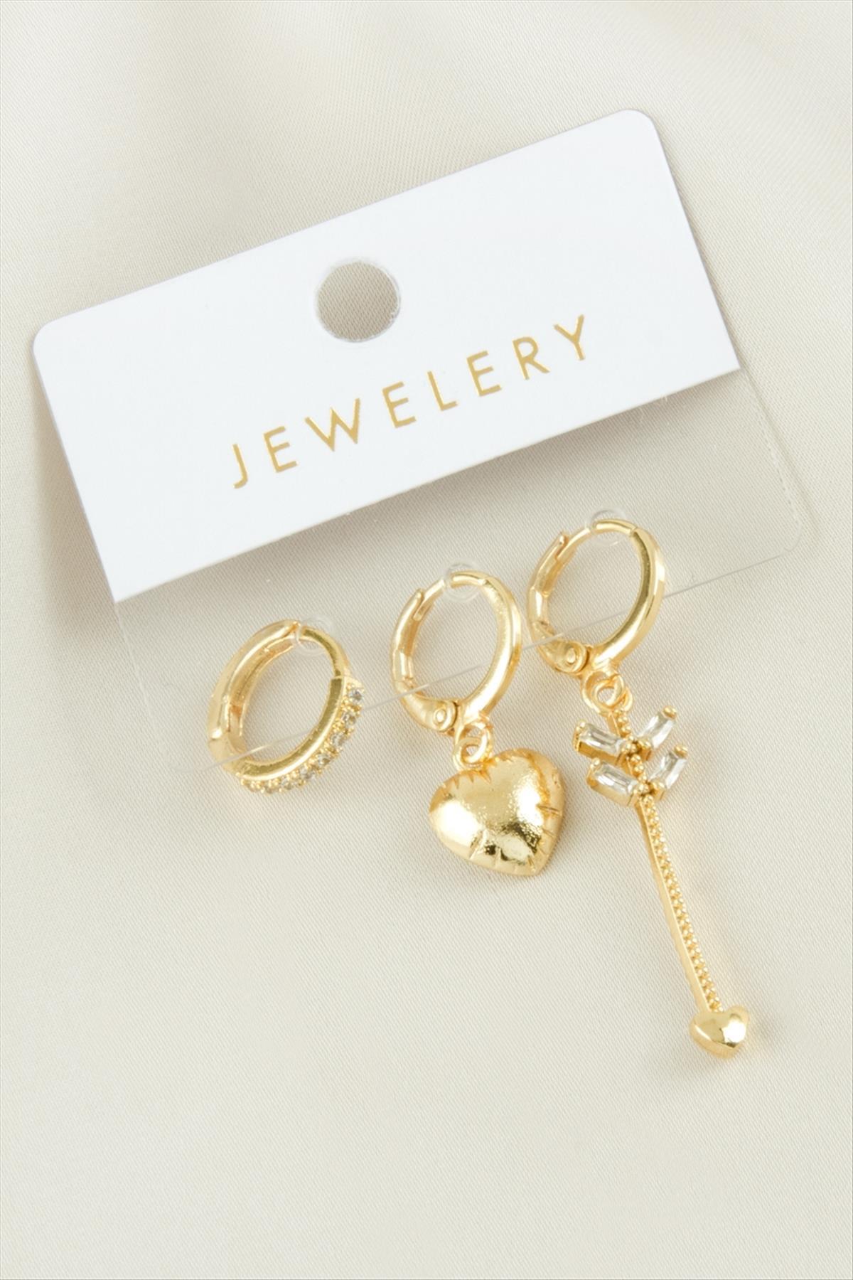 3 Adet Kalp Zirkon Taşlı Küpe
