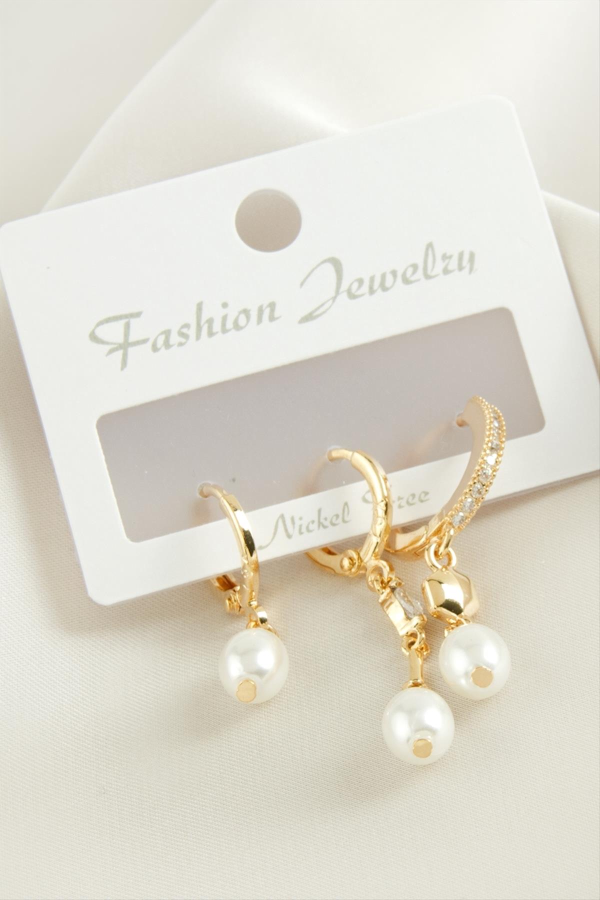 3 Adet Oval İnci Zirkon Taşlı Küpe