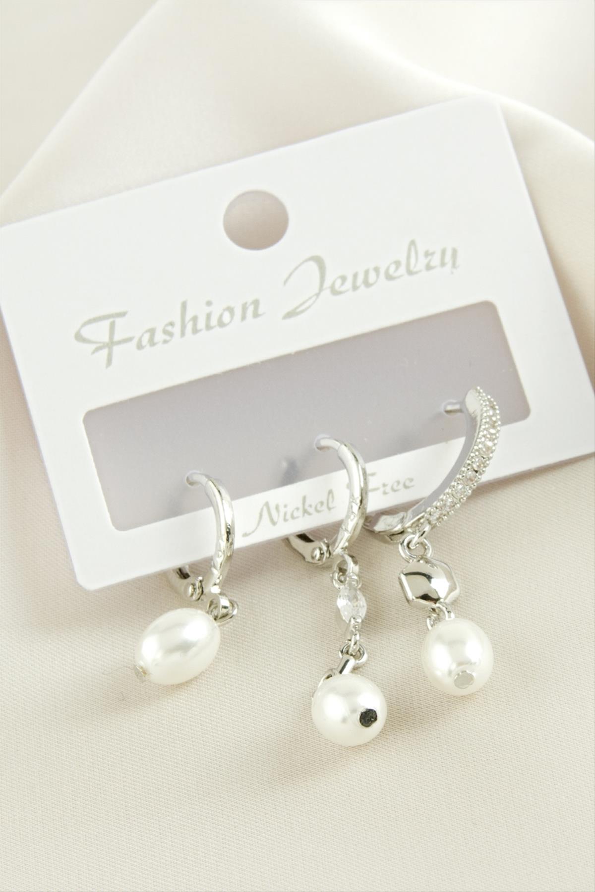 3 Adet Oval İnci Zirkon Taşlı Küpe-Gümüş Rengi