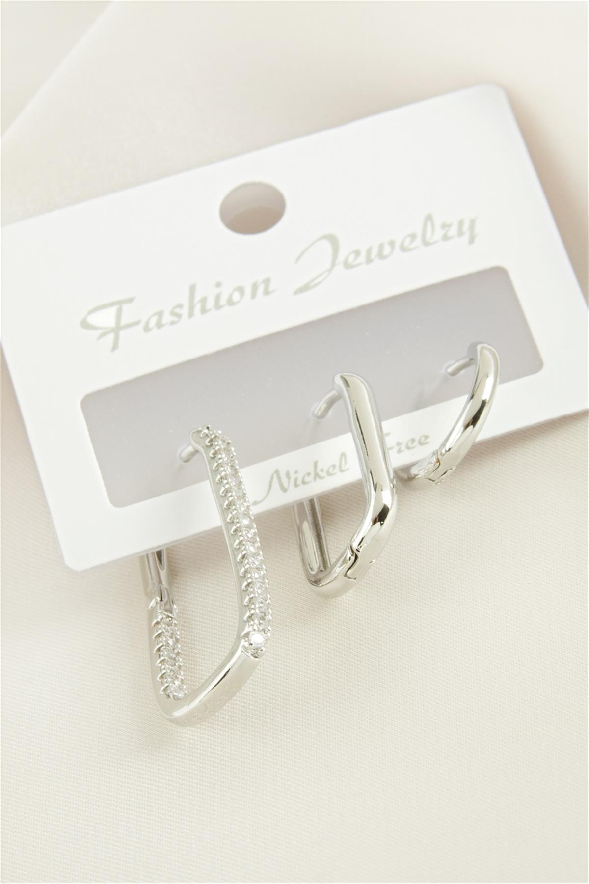 3 Adet Oval Zirkon Taşlı Küpe-Gümüş Rengi