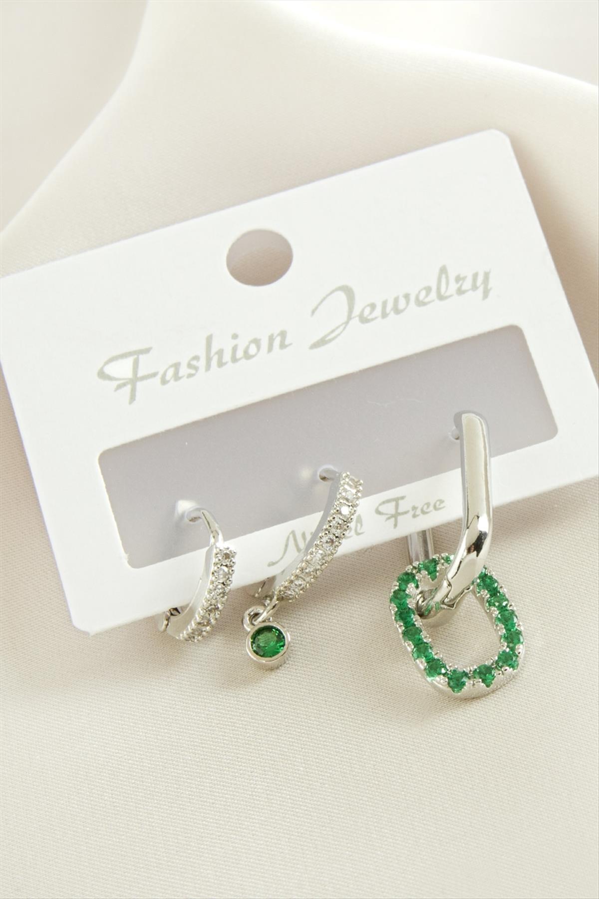 3 Adet Oval Zirkon Taşlı Küpe-Gümüş Rengi