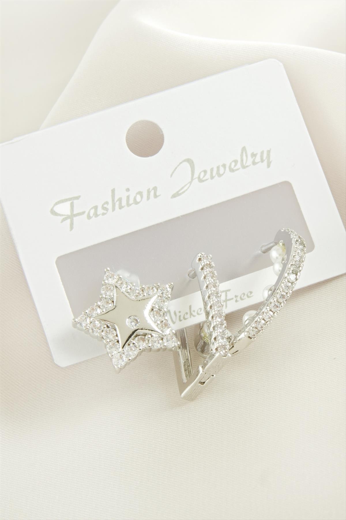 3 Adet Yıldız İnci Zirkon Taşlı Küpe-Gümüş Rengi