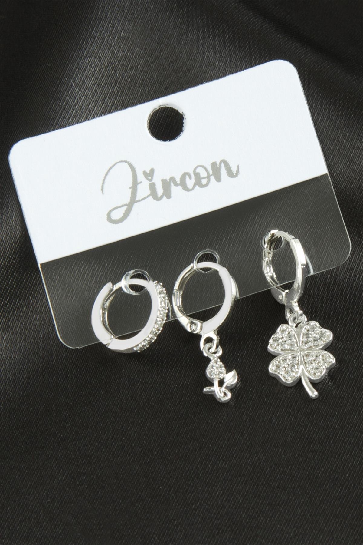 3 Adet Yonca Zirkon Taşlı Küpe-Gümüş Rengi
