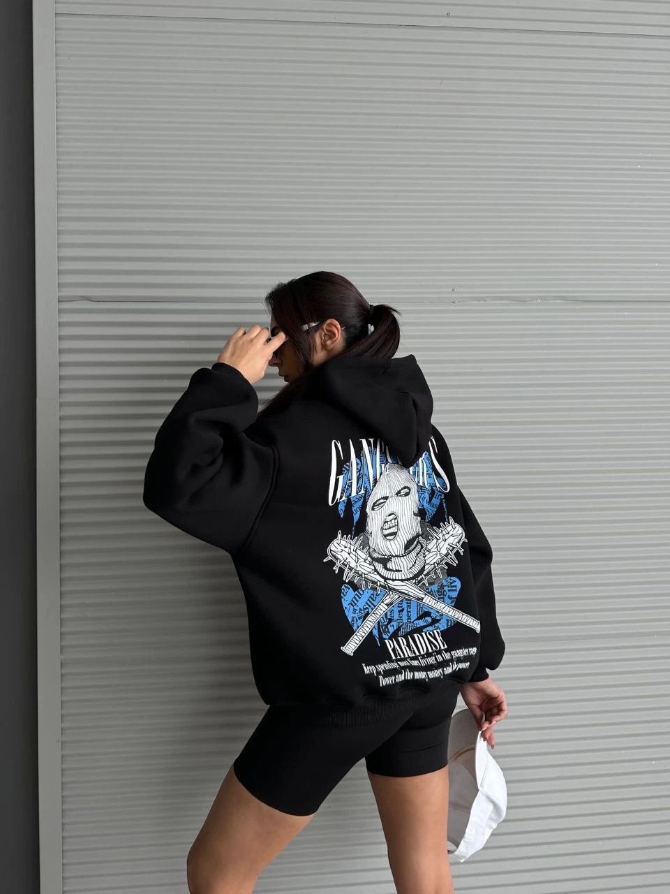 3 İplik Şardonlu Oversize Kafa Baskılı Sweat Siyah (Beden: L)