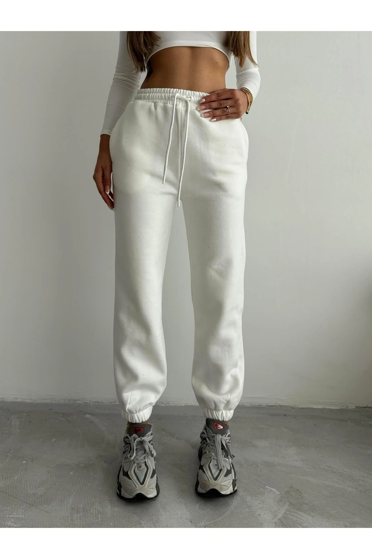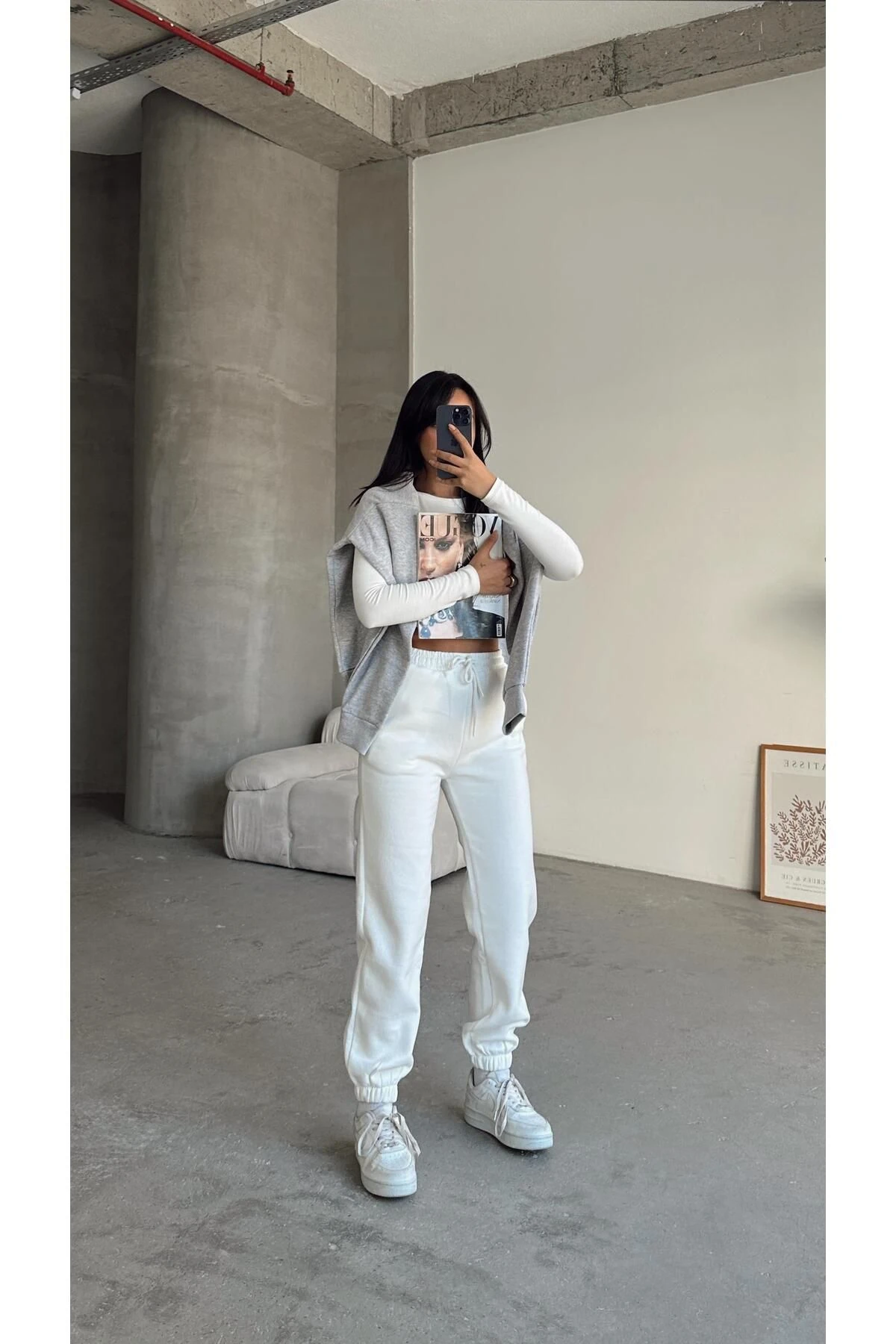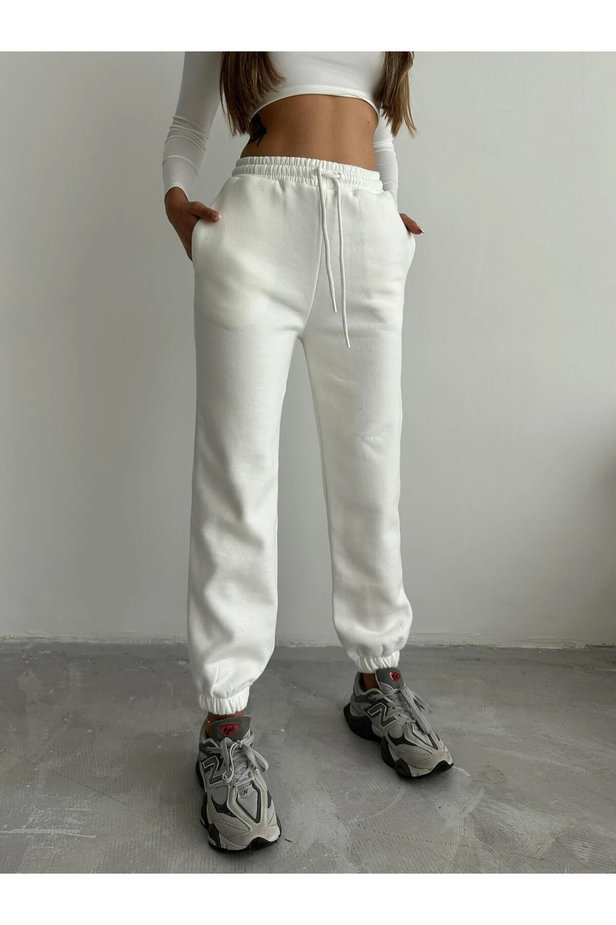 3 İplik Şardonlu Paça Lastikli Eşofman Beyaz İs001 (Beden: M)