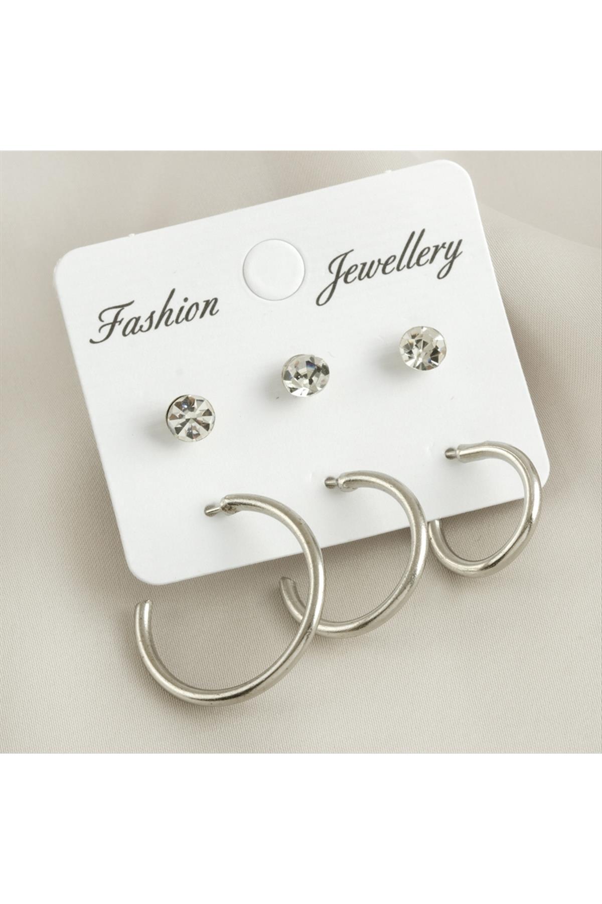 6 Adet Boru Taşlı Halka Küpe 1,5-2-2,5 cm-Gümüş Rengi