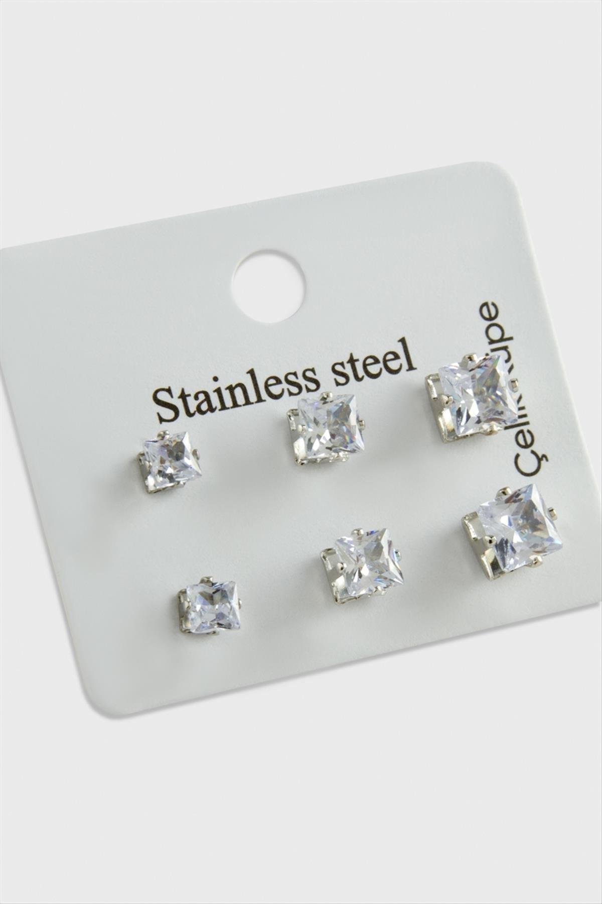 6 Adet Kare Zirkon Tek Taşlı Çelik Küpe-Gümüş Rengi