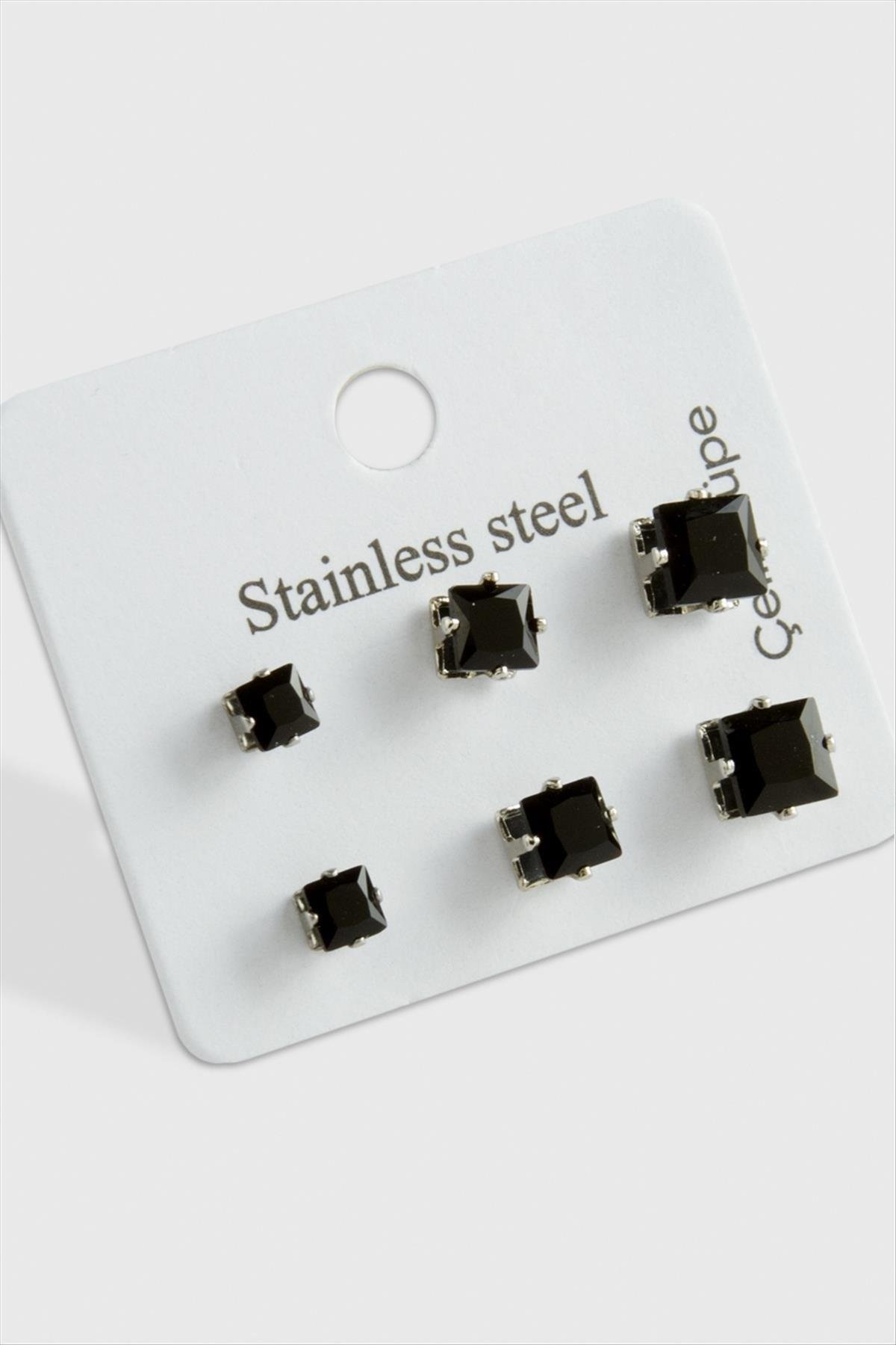 6 Adet Kare Zirkon Tek Taşlı Çelik Küpe-Siyah