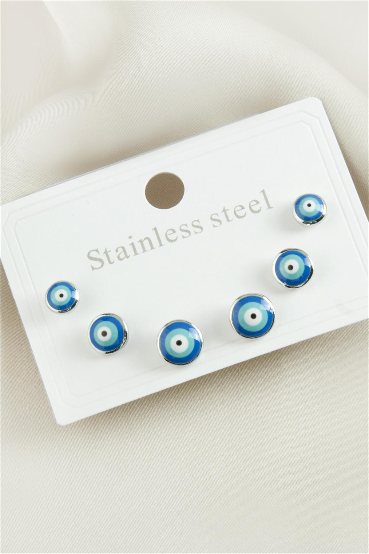 6 Adet Nazar Mineli Çelik Küpe-Gümüş Rengi