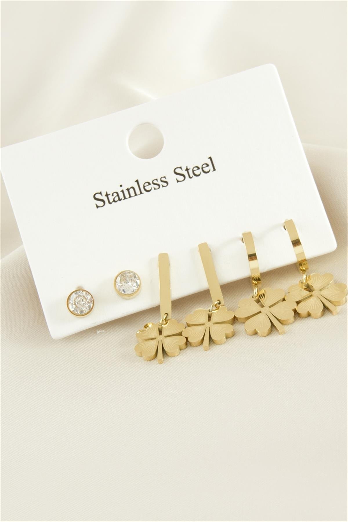 6 Adet Yonca Zirkon Taşlı Lüks Çelik Küpe-Sarı