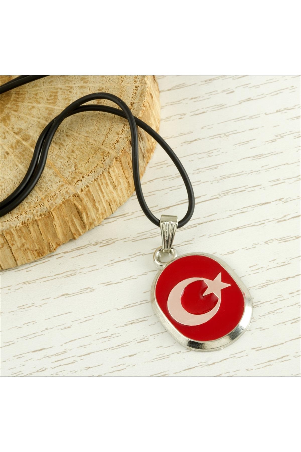 Ay Yıldız Metal Vinlex Deri Kolye-Kırmızı