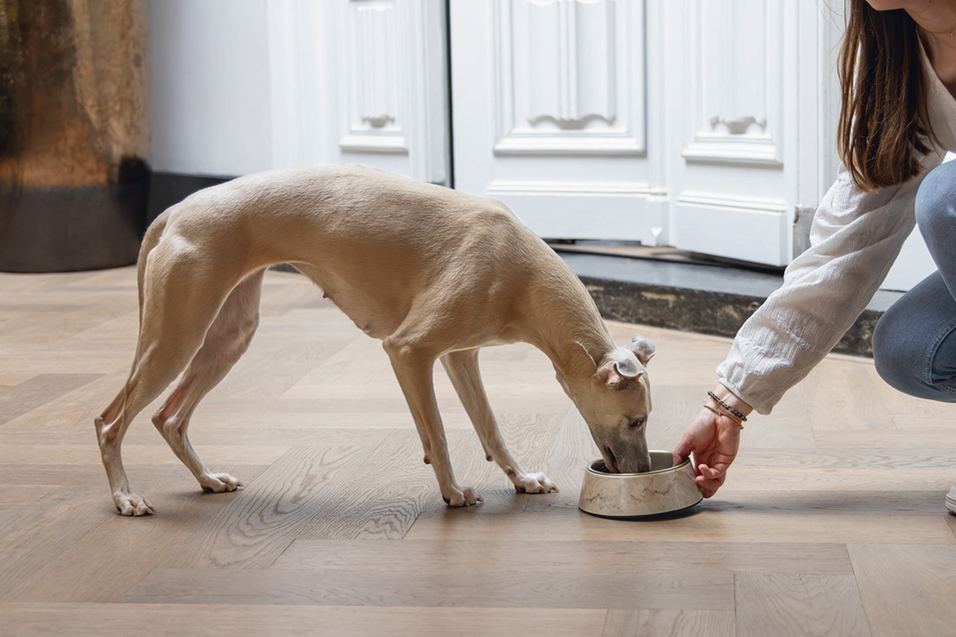 Beeztees DBL Köpek Mama Su Kabı, Mat Altın Rengi Paslanmaz Çelik, Bej Mermer Görünümlü, 17,5cm, 350m