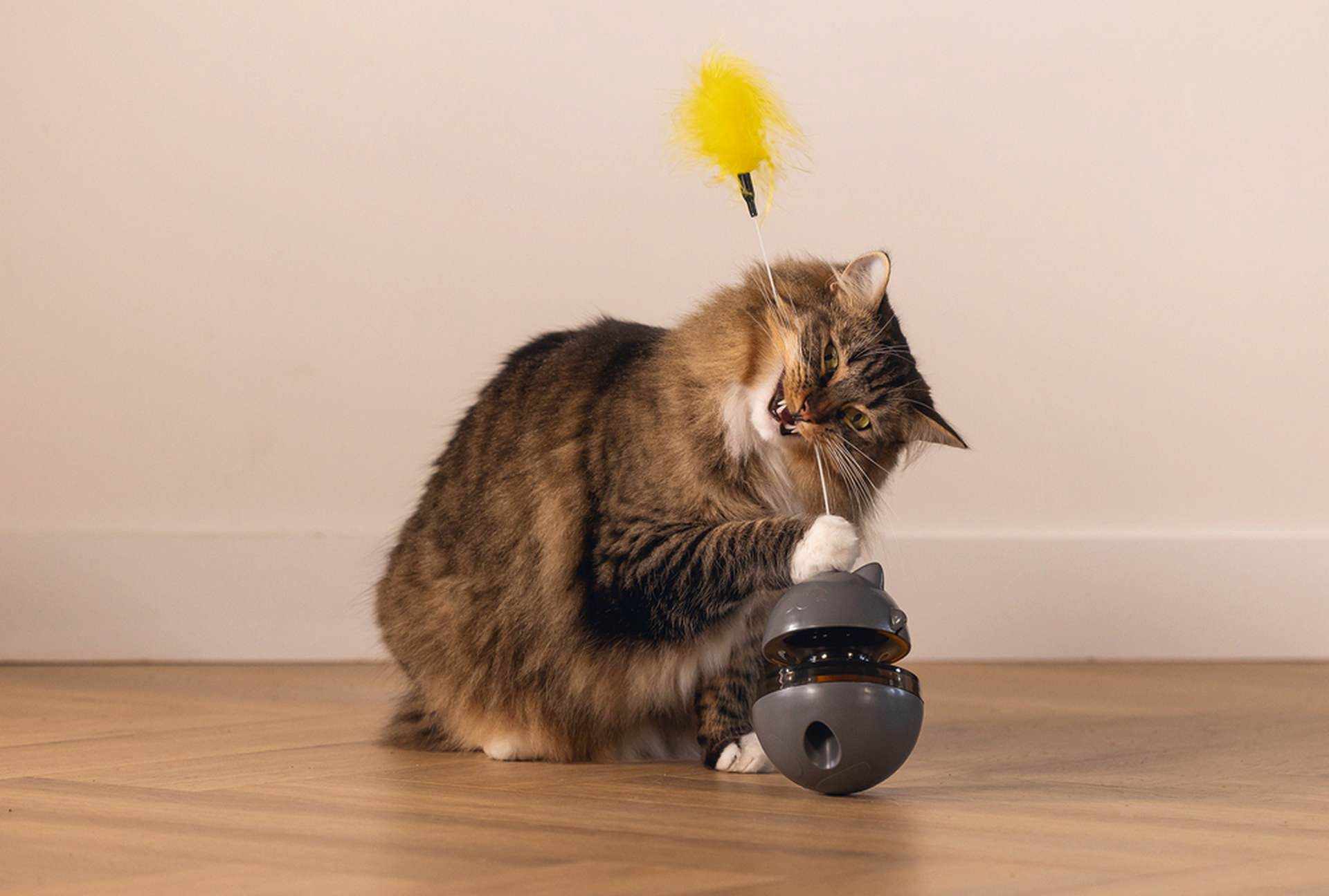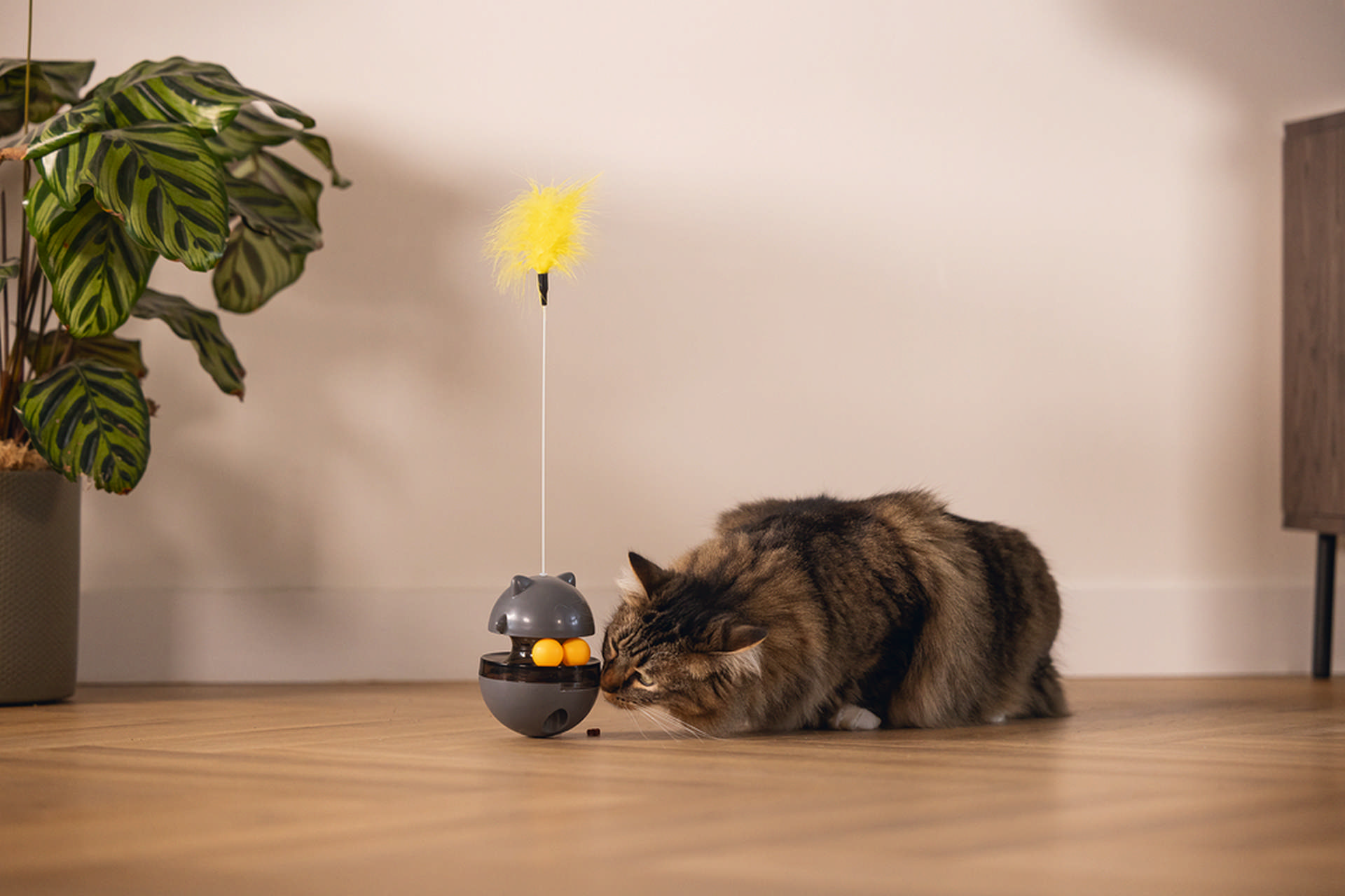 Beeztees Cat Toys Wibol, çeşitli oyun elementleri içerir. Oyuncağın altı yuvarlak ve ağırlıklıdır, bu da bir devinim etkisi yaratır. Ayrıca, oyuncakta iki oyun topunun saklandığı bir yarık bulunmaktadır. Bu top her seferinde kediniz oynamaya başladığında farklı bir yere yuvarlanacak ve sallanacaktır. Kedi oyuncağı, lezzetli kedi atıştırmalıkları ile doldurulabilir! Bu, kedinizi oyunlu bir şekilde ödüllendirmenizi sağlar. Üst kısmı gevşeterek atıştırmalıkları oyuncak içine koyabilirsiniz. Daha sonra oyuncak tarafındaki kaydırıcıyı kullanarak alttaki bölmeleri açabilir ve oyuncak hareket etmeye başladığında atıştırmalıkların dışarı düşmesini sağlayabilirsiniz. Oyuncağı daha eğlenceli hale getirmek için, Wibol’un üst kısmına bir yaylı uzun çubuk takılmıştır. – Devrilme etkisi – Oyuncak top ile – Yay dahil – Atıştırmalık top olarak kullanılabilir – Saatlerce eğlence – Farklı oyun elementleri Ölçüler: 10x10x13.5 cm