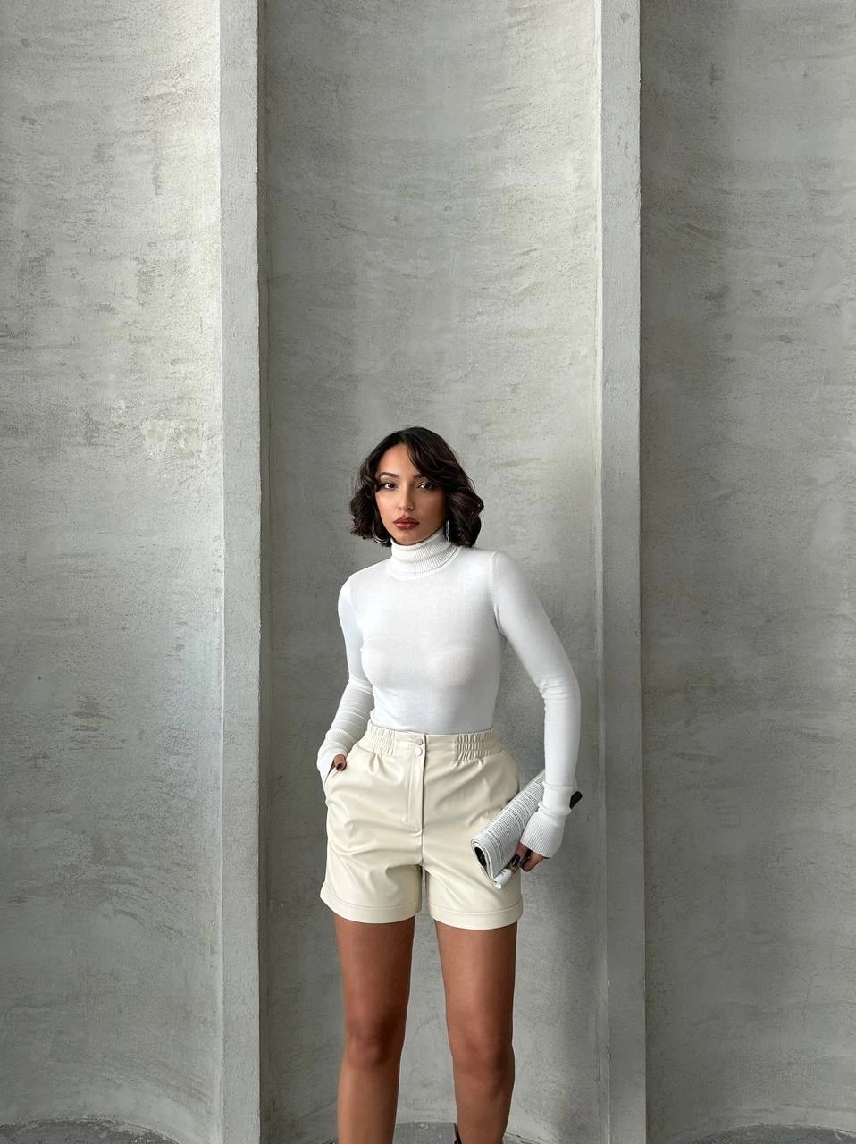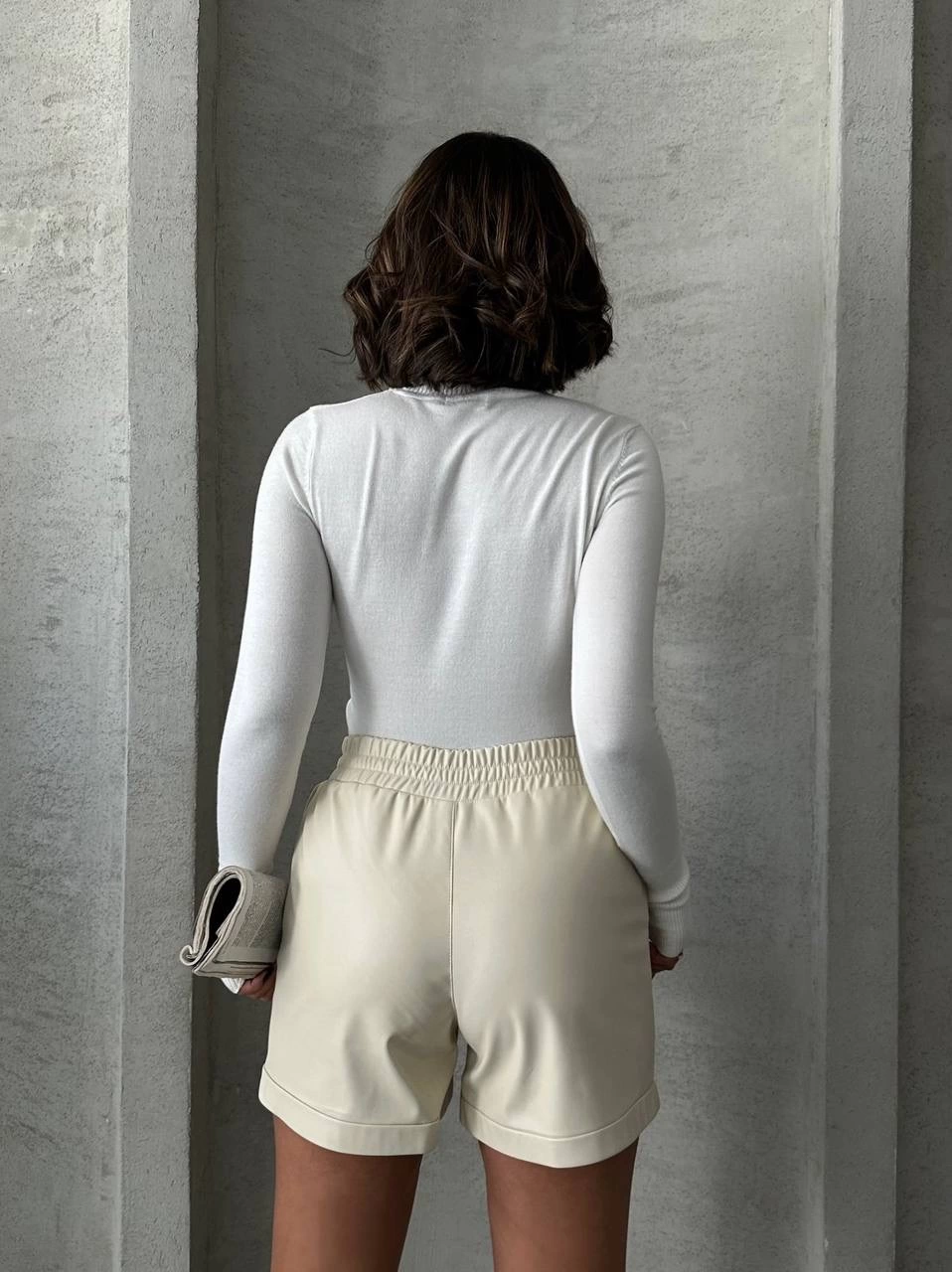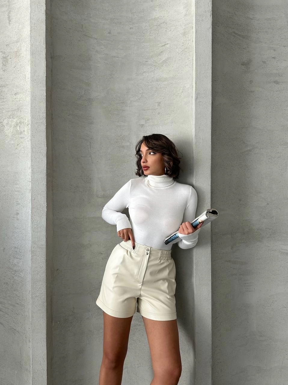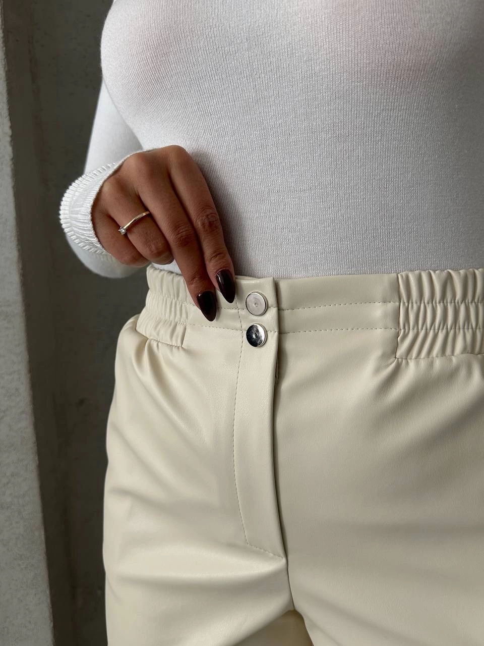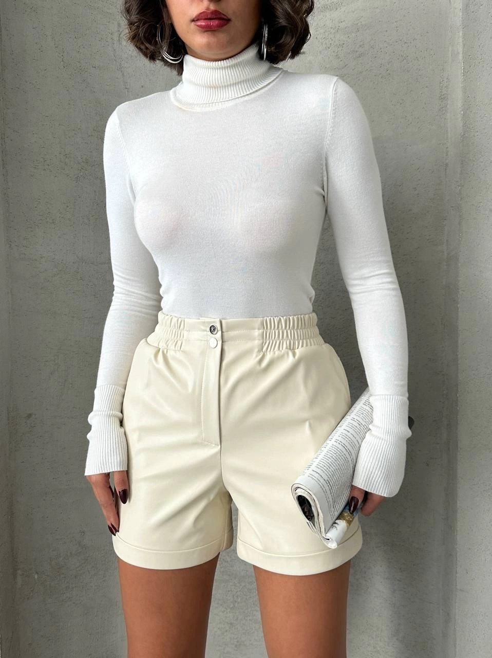 Şık ve modern tasarımıyla dikkat çeken Krem Beli Lastikli Çıtçıtlı Deri Şort, gardırobunuzun vazgeçilmezi olmaya aday!
