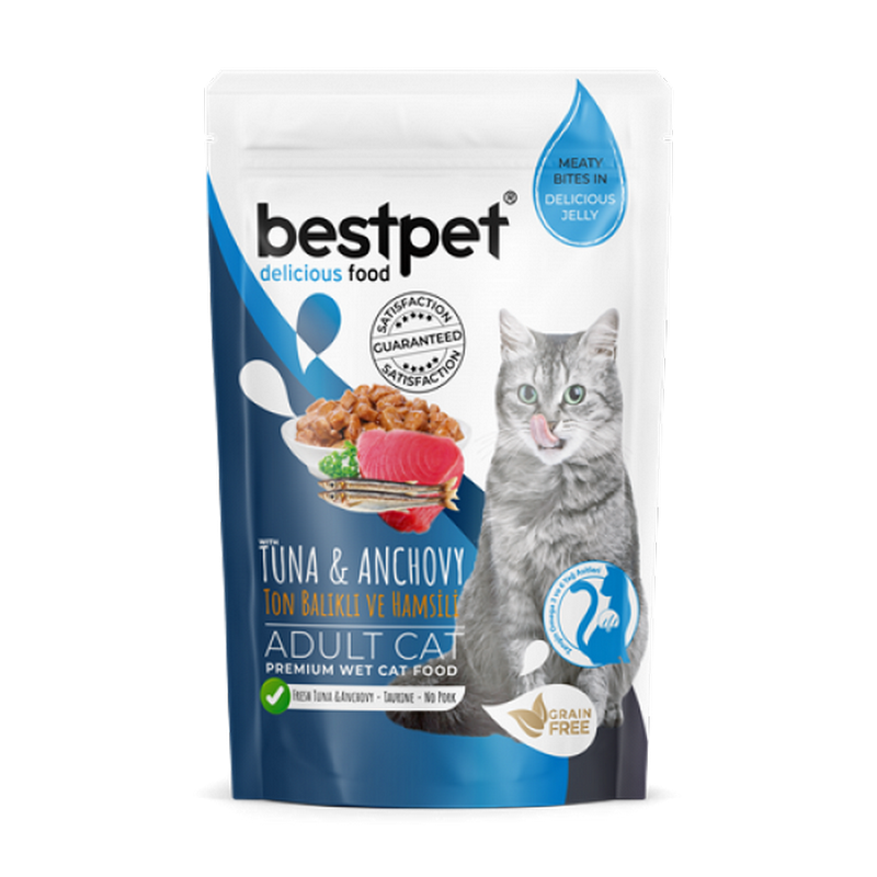 Bestpet 85 gr X 24 ADET Yetişkin Kediler İçin, Tahılsız, Jöle İçinde Tuna Ve Hamsi Parça Etli Yaş Mama