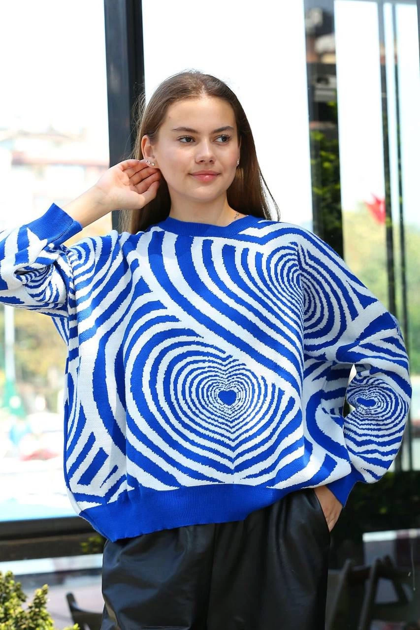 Beyaz Kalp Çizgili Kazak Saks Mavisi (Beden: Standart)