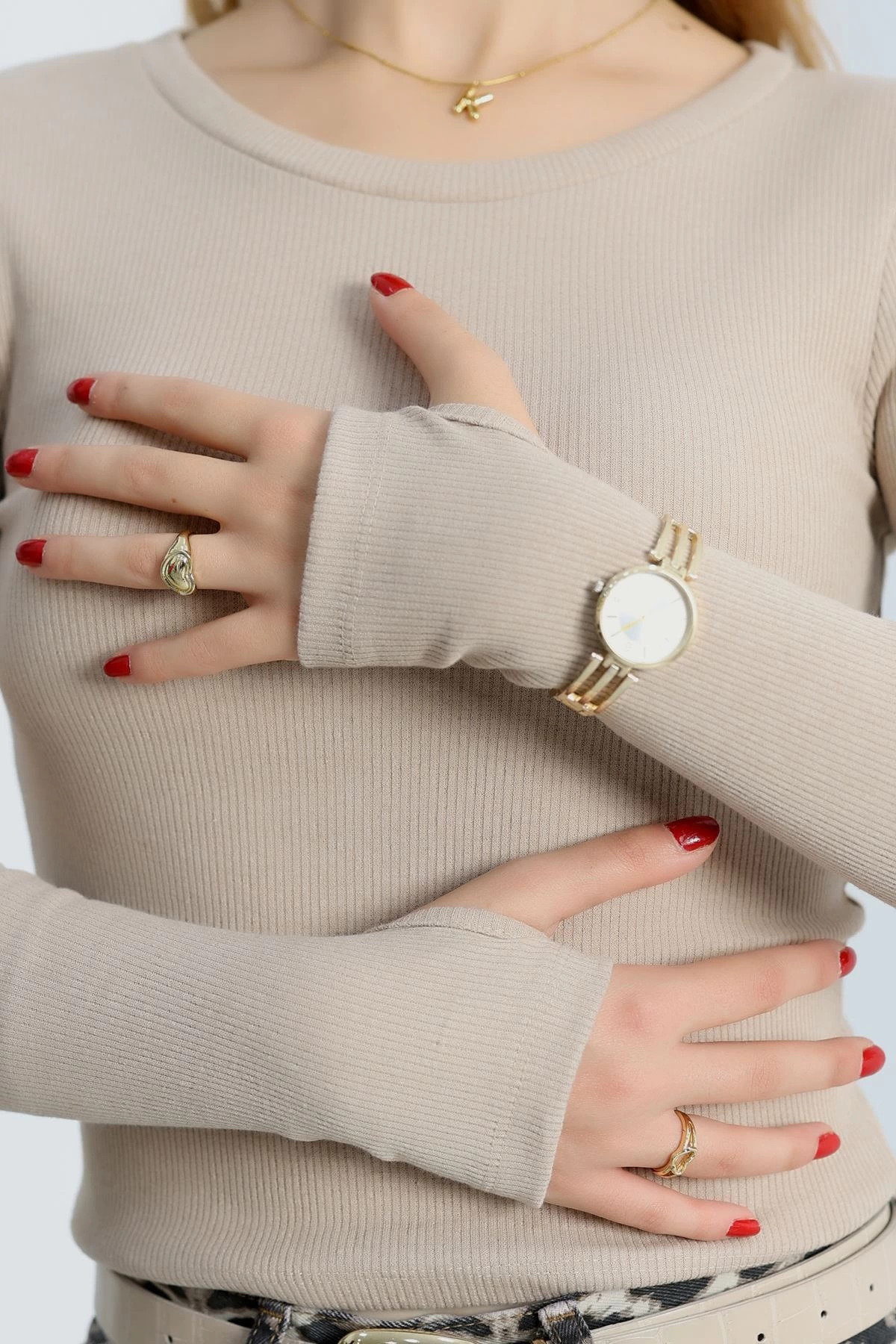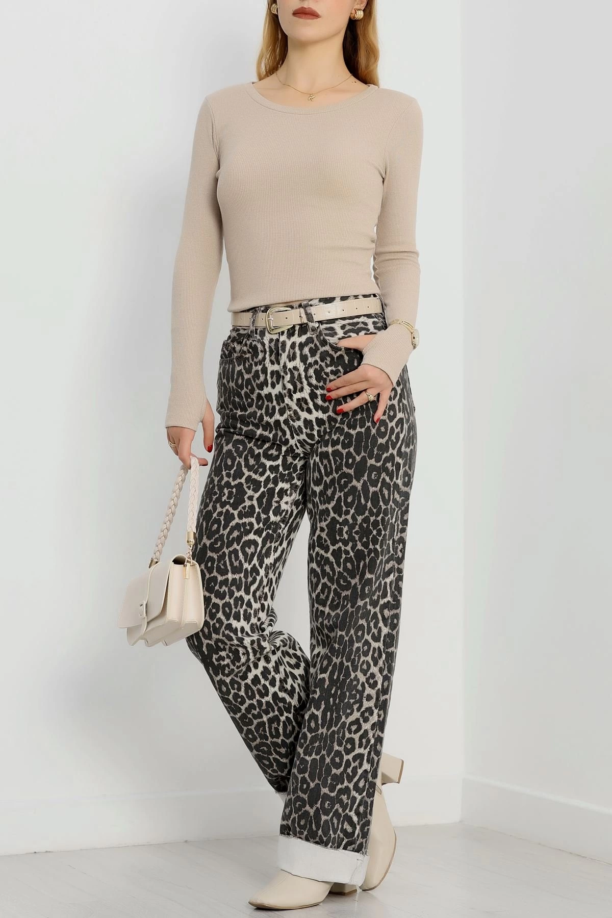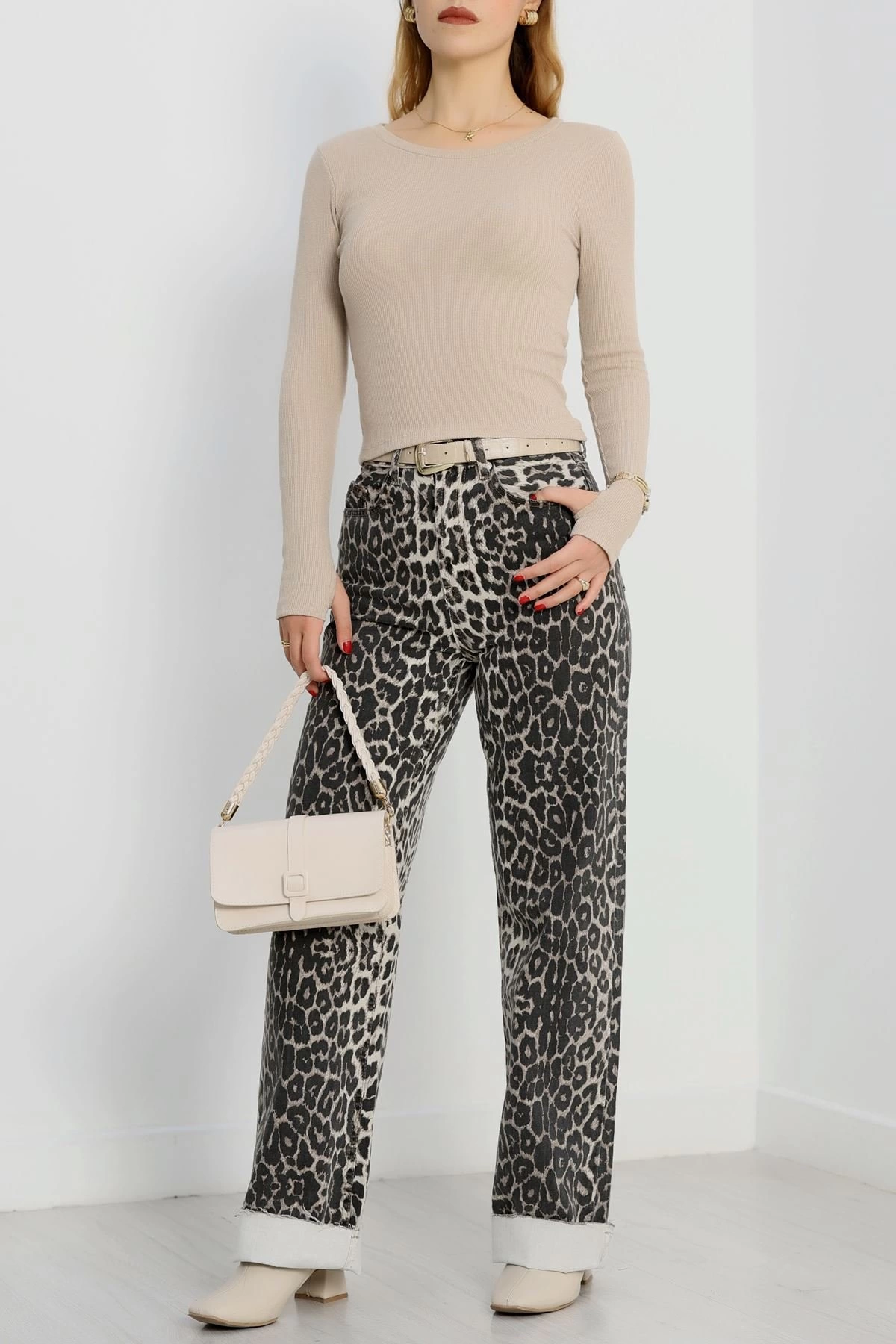 Bisiklet Yaka Parmak Geçmeli Kaşkorse bluz bej a3829 (Beden: M)