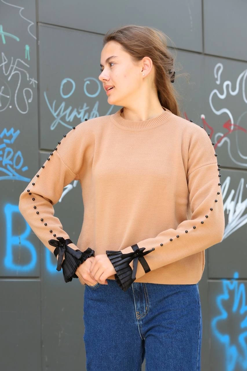 Boncuklu bile detaylı kazak vizon (Beden: STANDART)