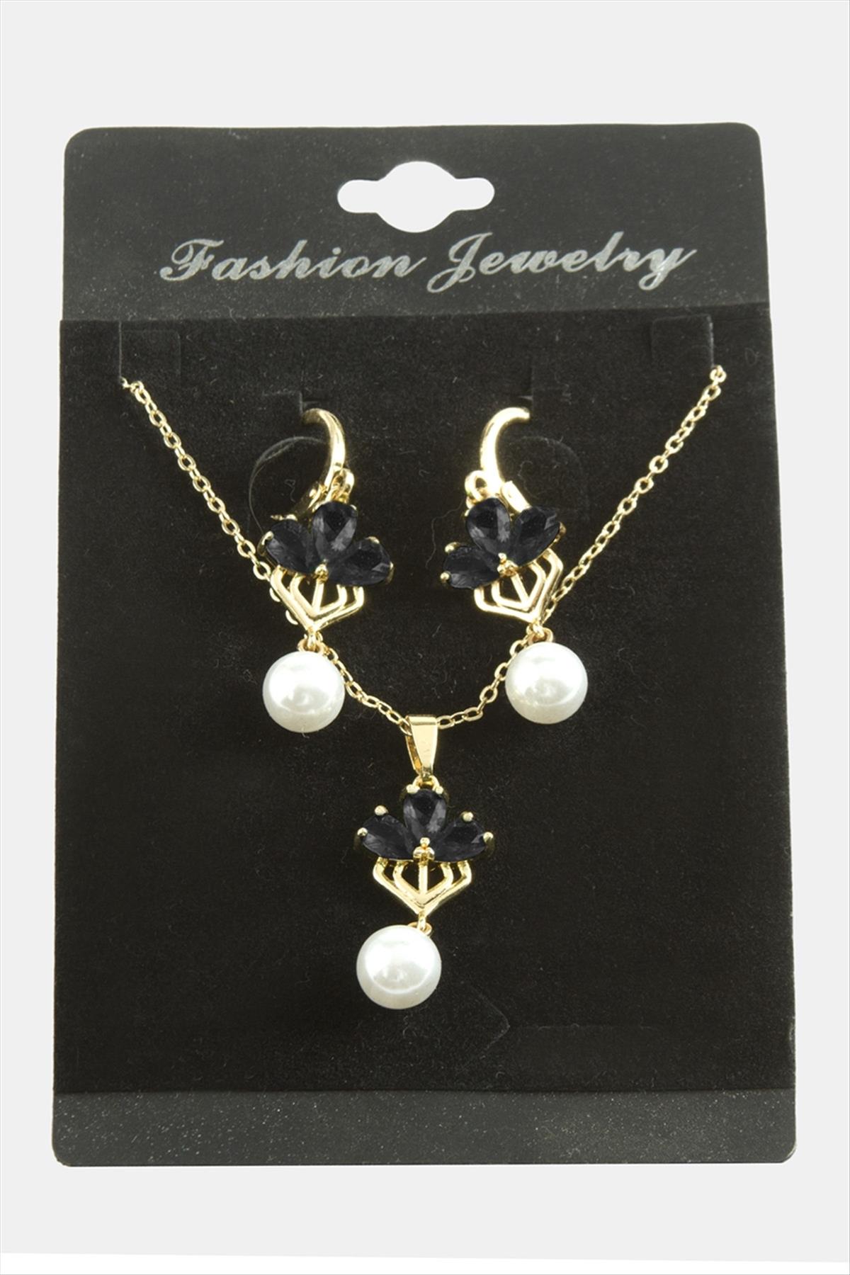 Çiçek İnci Zirkon Taşlı Set Kolye-Siyah