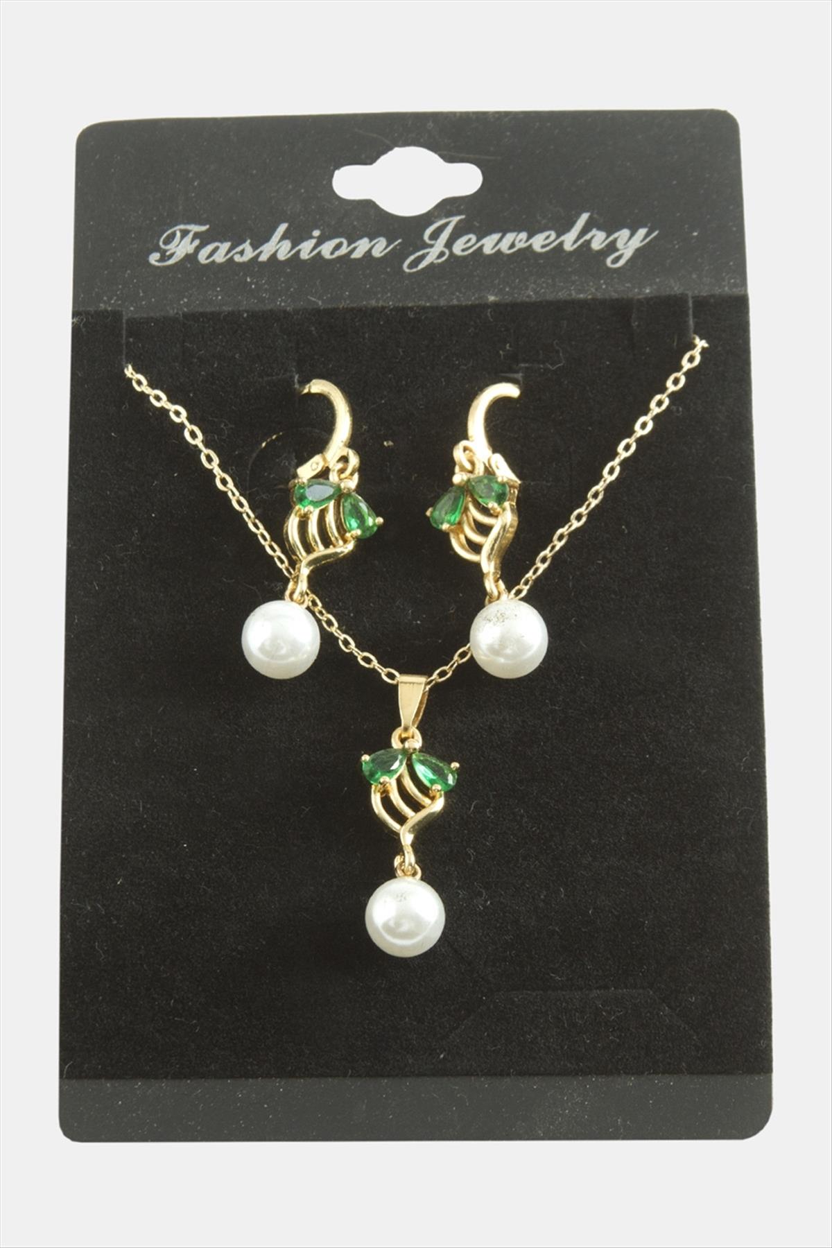Çiçek İnci Zirkon Taşlı Set Kolye-Yeşil