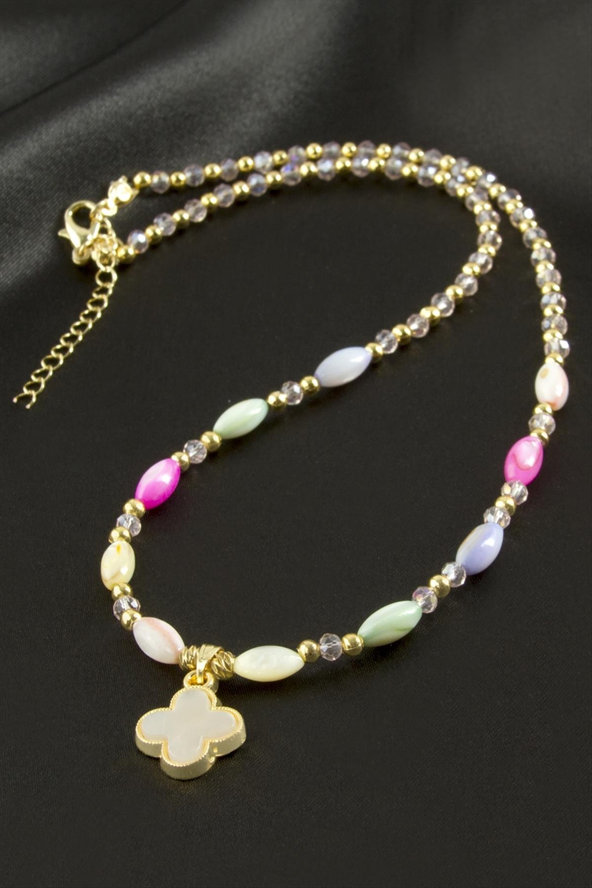Çiçek Sedef Cam Boncuk Kristal Kolye