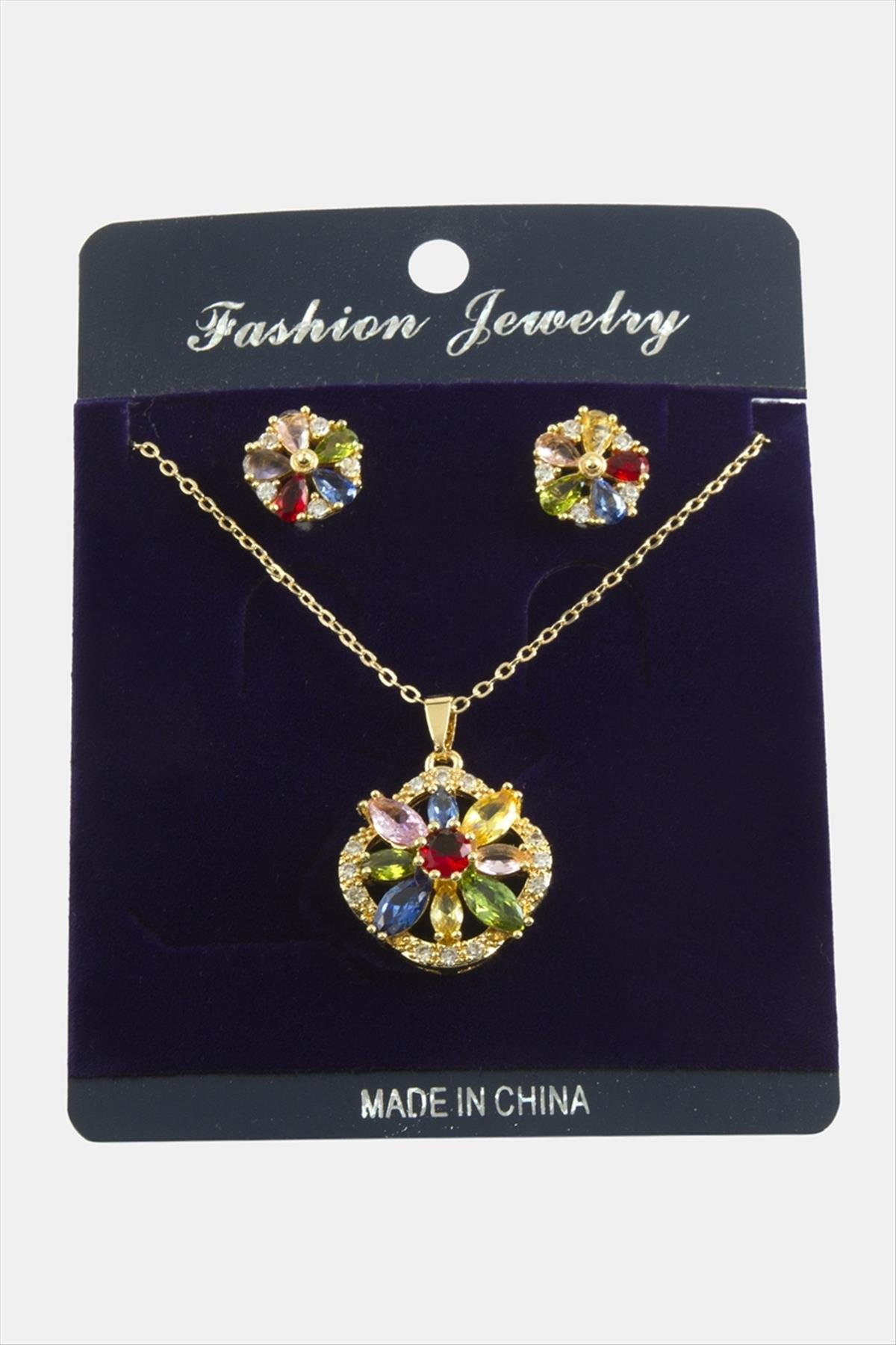 Çiçek Zirkon Taşlı Set Kolye-Renkli