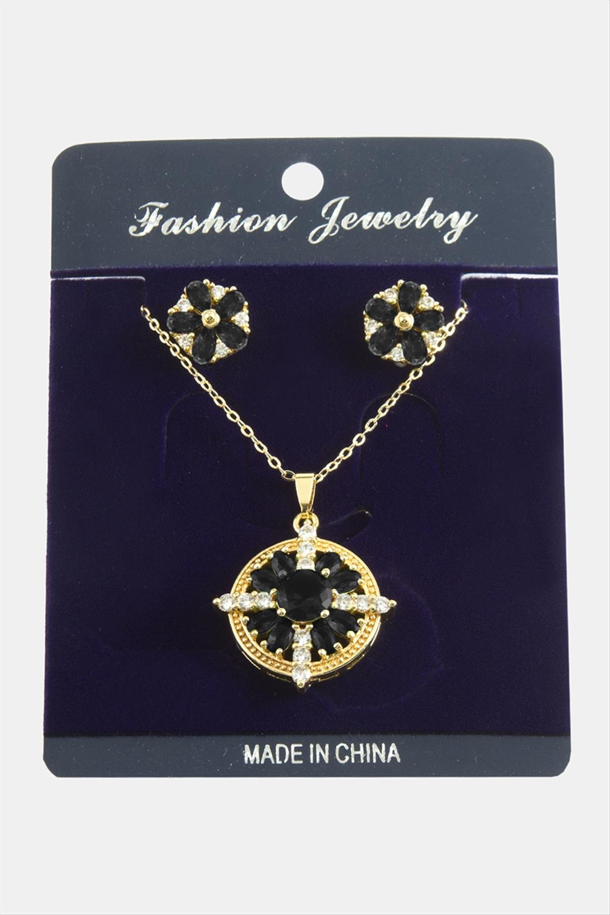 Çiçek Zirkon Taşlı Set Kolye-Siyah