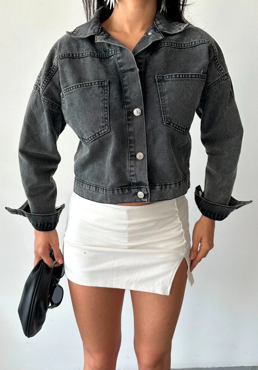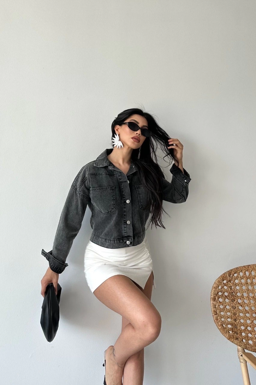Çift Cepli Kol Katlamalı Süper Taş Enzim Yıkama Crop Kot Ceket Füme D2000 (Beden: L)