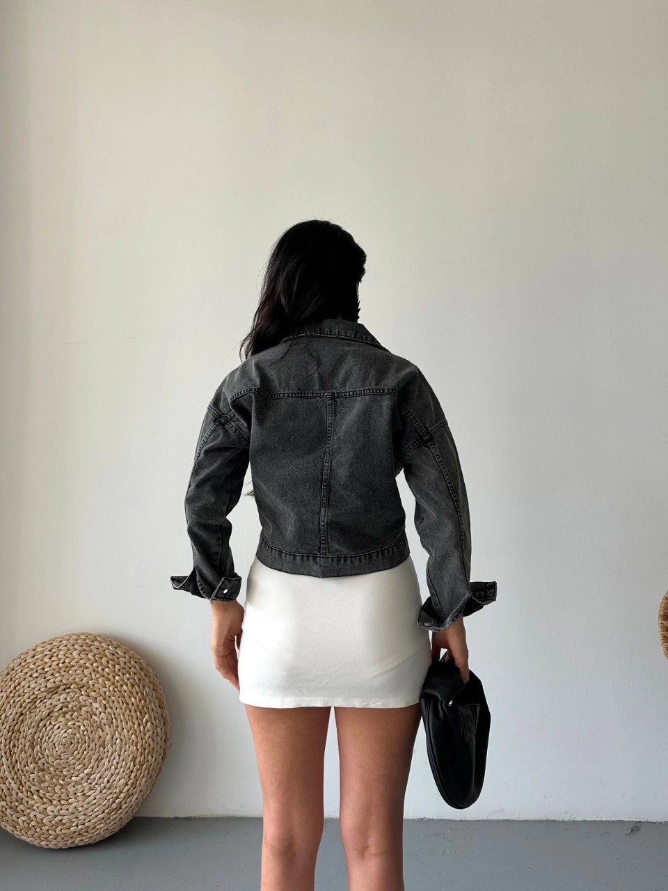 Çift cepli kol katlamalı süper taş enzim yıkama crop kot ceket füme d2000 (Beden: M)