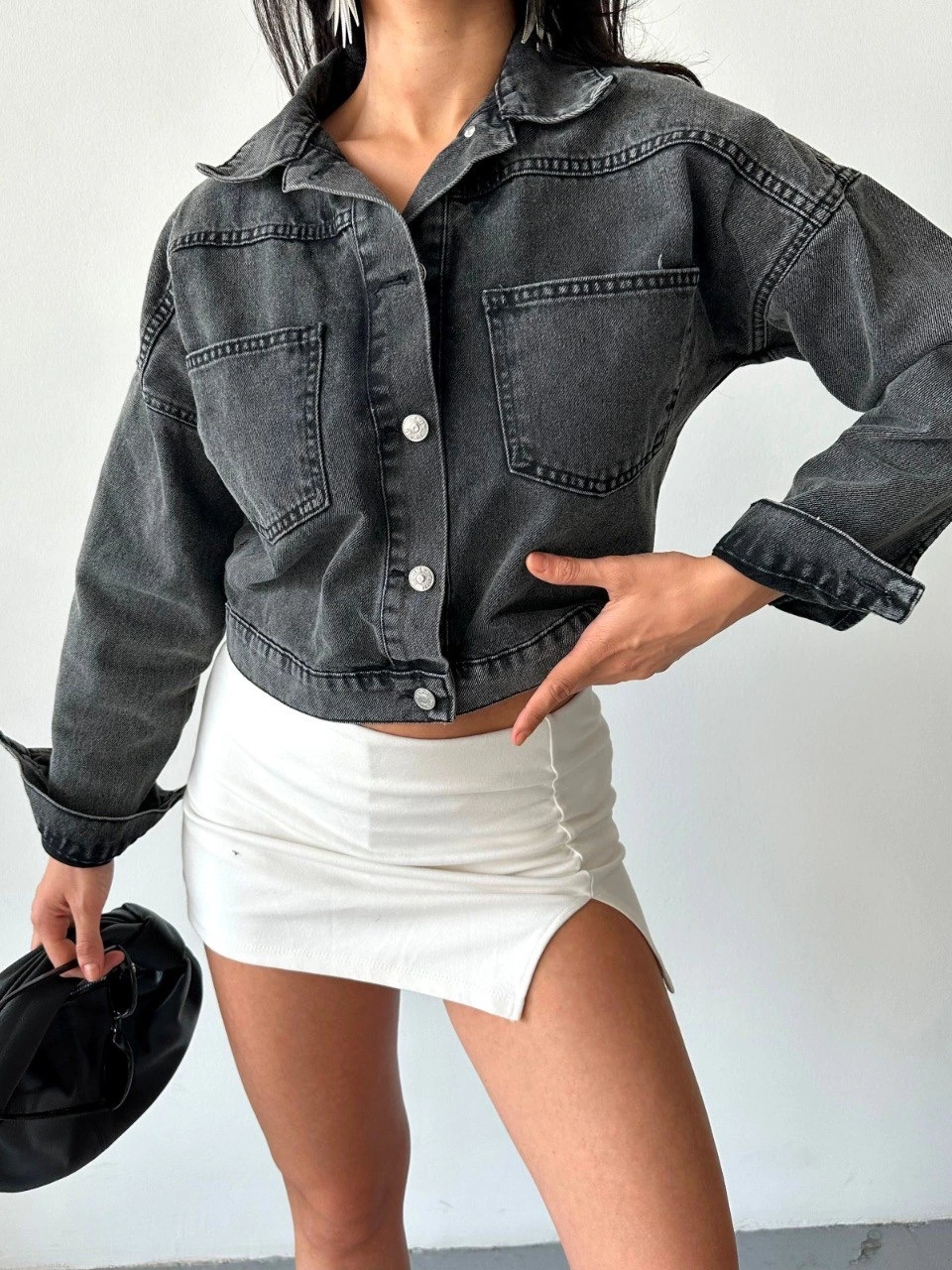 Çift Cepli Kol Katlamalı Süper Taş Enzim Yıkama Crop Kot Ceket Füme D2000 (Beden: M)
