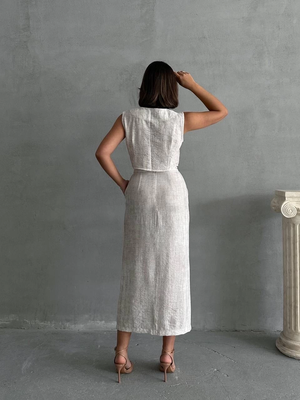 ZENGEZUR MALL markasının şık ve zarif tasarımıyla öne çıkan çilek takımı, etek ve yelek kombinasyonuyla dikkat çekiyor.