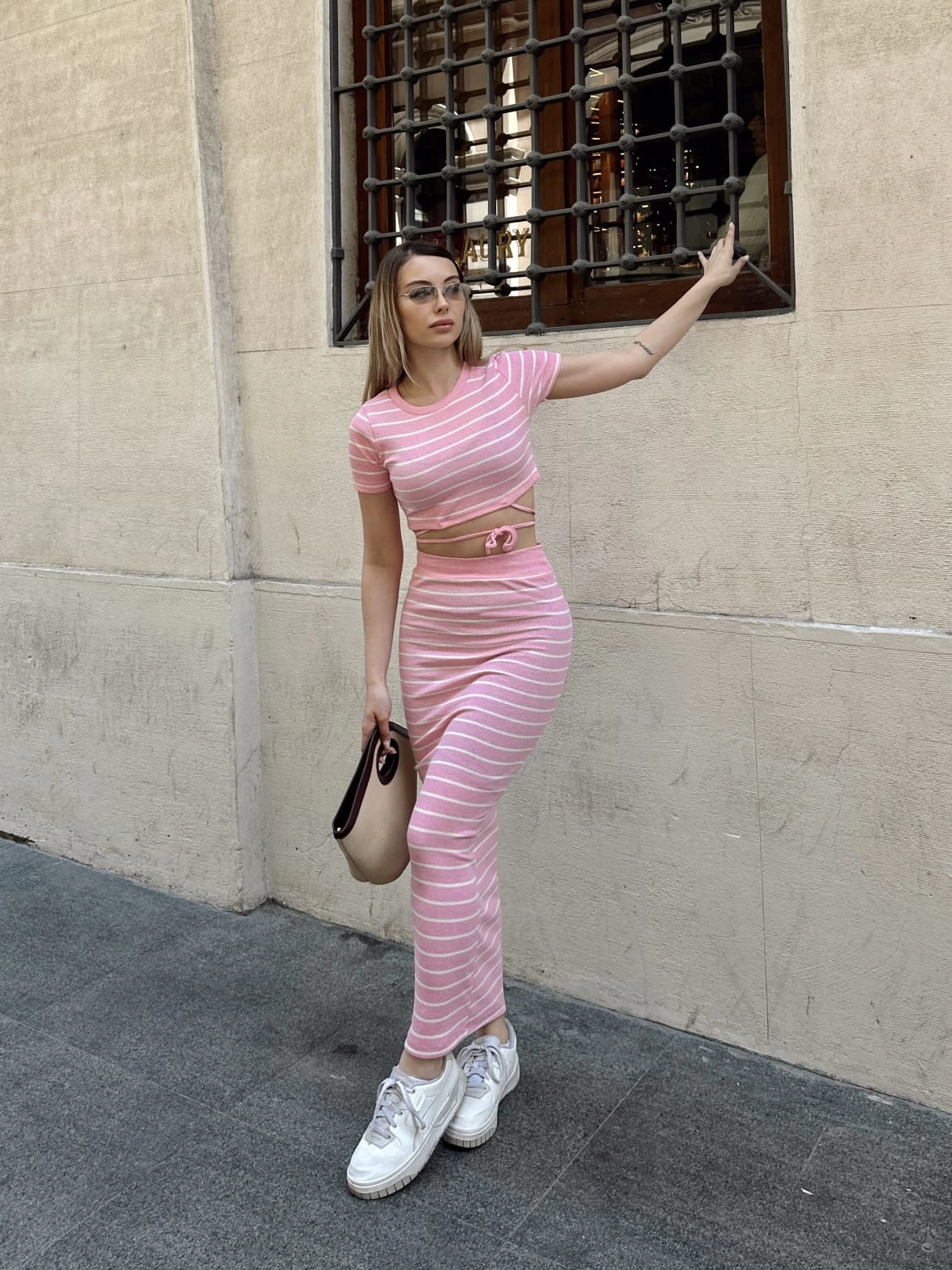 - Takımın üst kısmı pembe renkte ve çizgili desenlidir.