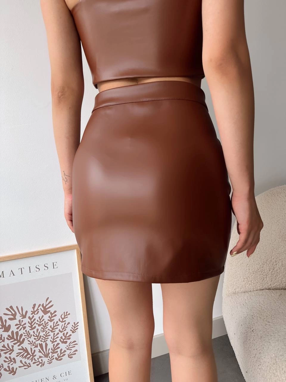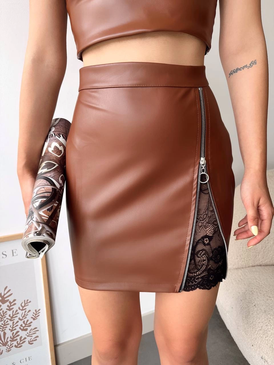 Dantelli fermuarlı deri etek kahve w24598 (Beden: S)