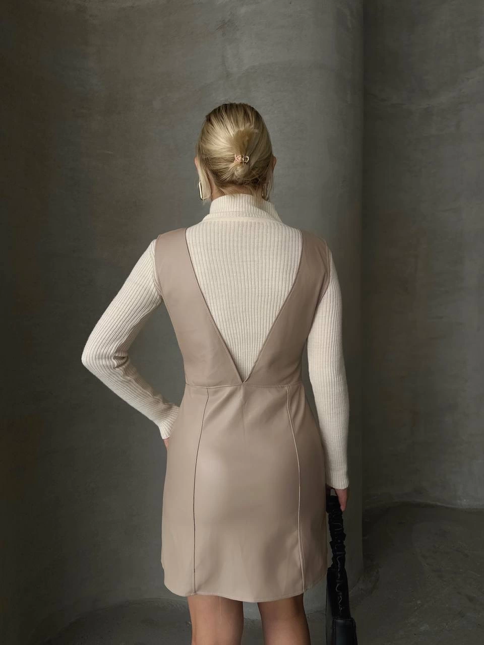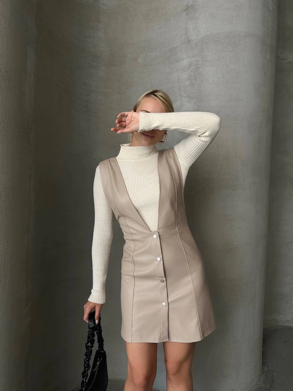 Bu şık deri jile elbise, gardırobunuzu tamamlayacak bir parça olacak. Bej rengi ile klasik ve şık bir görünüm sunarken, deri detayları ise tarzınıza modern bir dokunuş katıyor.