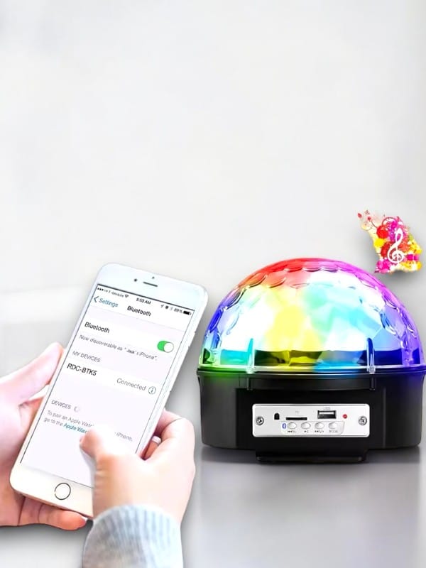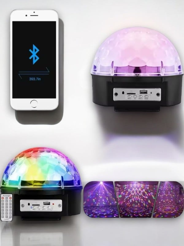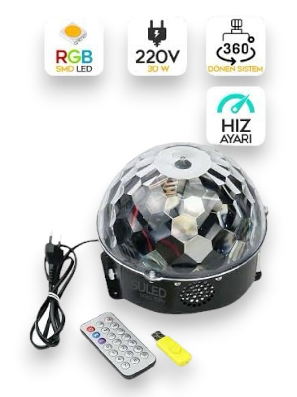 SD Kart ve USB Girişli LED Işıklı Kristal Yarım Küre ile kırmızı, mavi ve yeşil olmak üzere 3 farklı renk kombinasyonu müzik ritmine ayak uyduruyor.