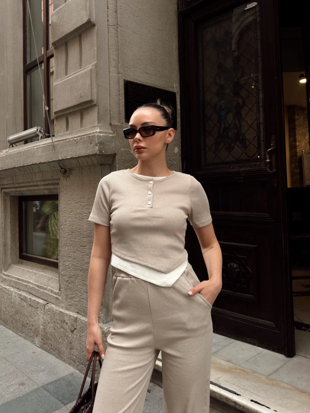 Şıklığı ve rahatlığı bir arada sunan Düğme Yakalı Bej Alt Üst Takım S3943, gardırobunuzun vazgeçilmezi olmaya aday.