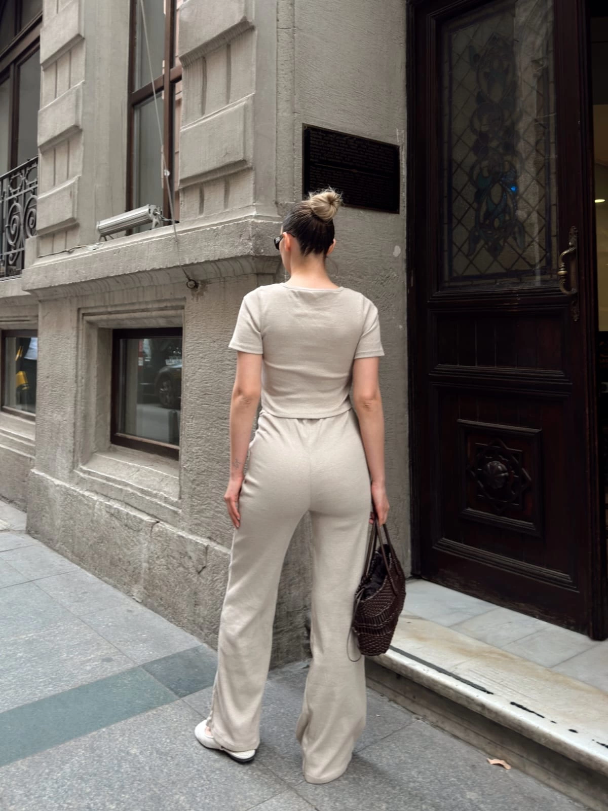 Şıklığı ve konforu bir arada arayan kadınların tercihi olan Düğme Yakalı Bej Alt Üst Takım S3943, her tarza uyum sağlar.