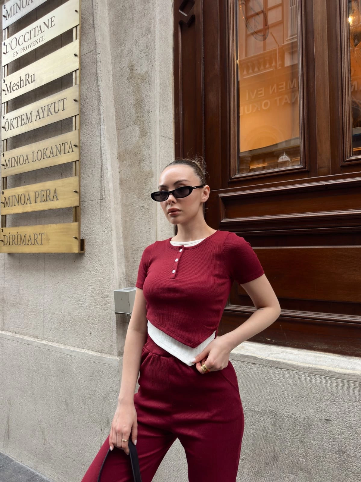 Bordo rengin şıklığı ve rahatlığı buluşturan Düğme Yakalı Bordo Alt Üst Takım S3943, kadın giyim kategorisindeki favori parçalar arasında yerini alıyor.